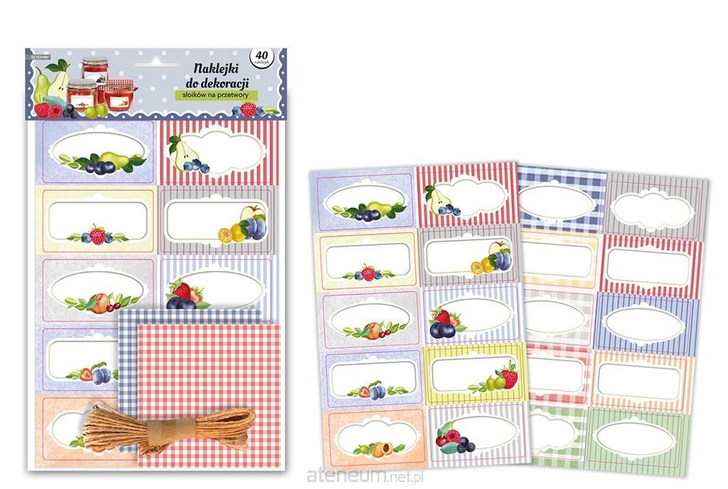 Zestaw zawiera 40 prostokątnych naklejek/etykiek do dekoracji słoików na przetwory. Na każdej naklejce miejsce na wpisanie nazwy. Dodatkowo znajduje się tam 10 krawatek i 6m naturalnej rafii