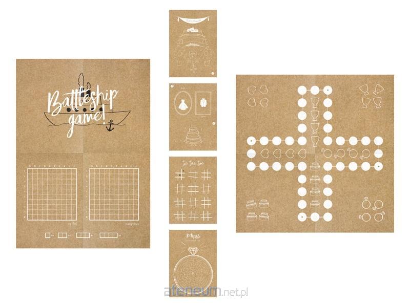 Zestaw gier dla dzieci na wesele, zawiera: 4 książeczki z grami (labirynt, wykreślanka, kolorowanka, kółko i krzyżyk, statki), 1 planszę do gry w chińczyka, 16 pionków, 1 drewnianą kostkę do gry.