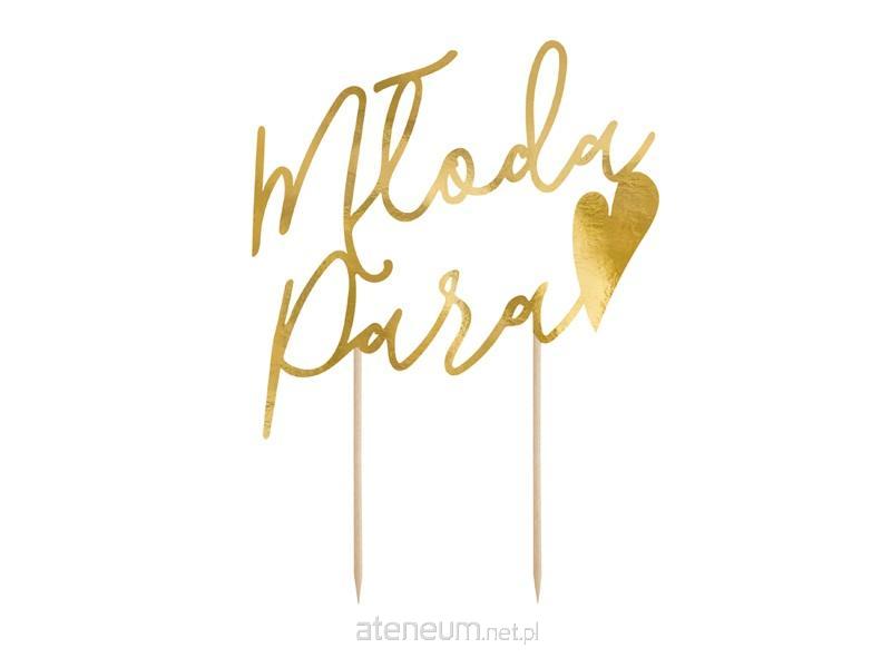 Topper na tort Młoda Para, wykonany z papieru lustrzanego w kolorze złotym, wysokość ok. 22,5 cm.