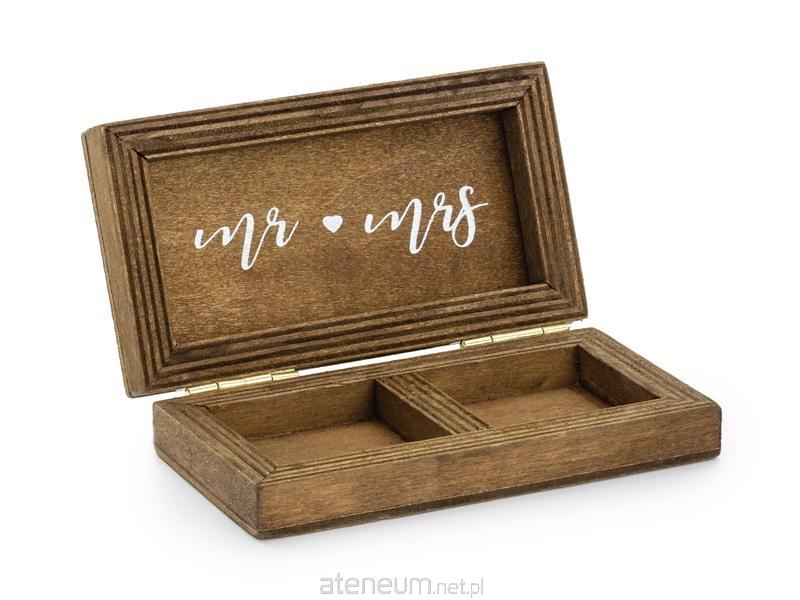 Drewniane pudełko na obrączki z białymi napisami, rozmiar zamkniętego pudełka ok. 10 x 5.5 cm, wysokość ok. 2 cm.