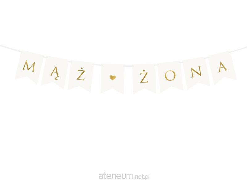Baner w kolorze białym ze złotym napisem Mąż Żona, do samodzielnego złożenia, zestaw zawiera literki i ok. 2,5 m białej tasiemki, wymiary po złożeniu: wysokość ok. 15 cm, długość ok. 110 cm.