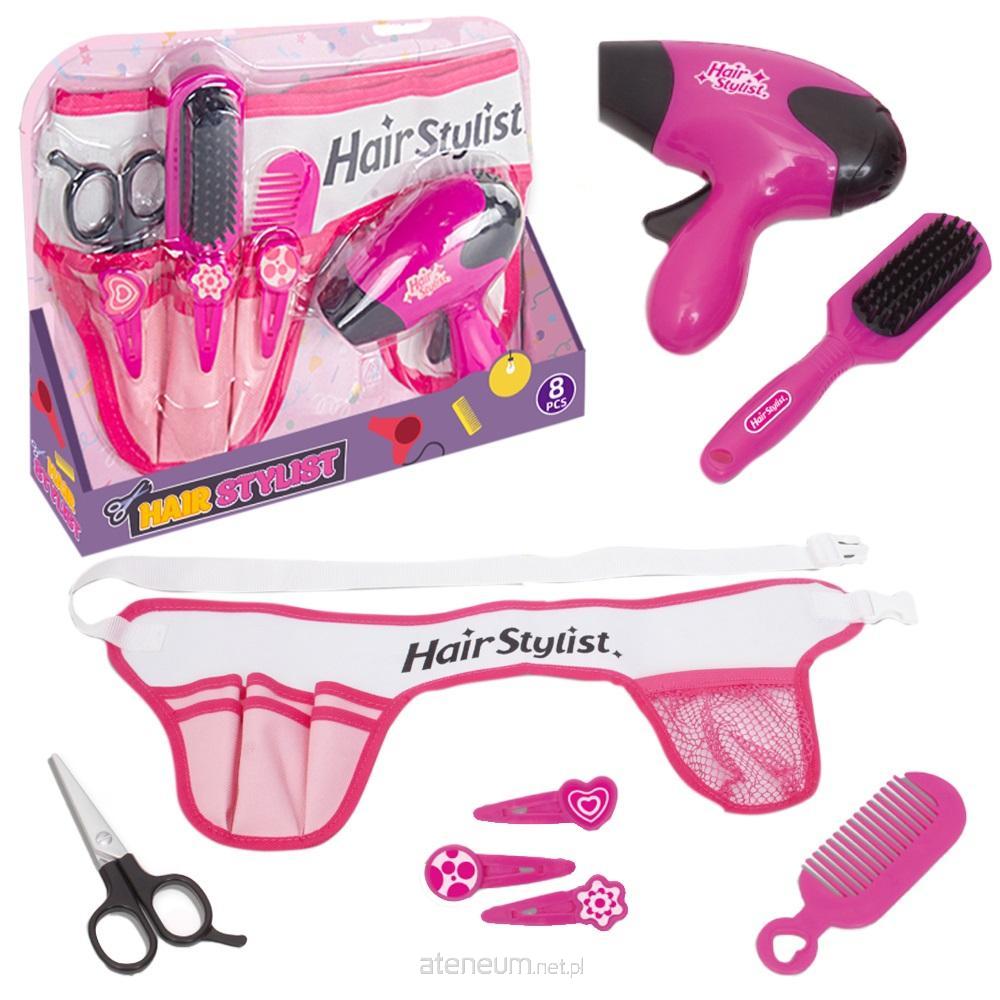 Zestaw 8-elementowy. Suszarka na frykcję, fartuszek na drobiazgi fryzjerskie, nożyczki, grzebień, szczotka, 3 spinki.