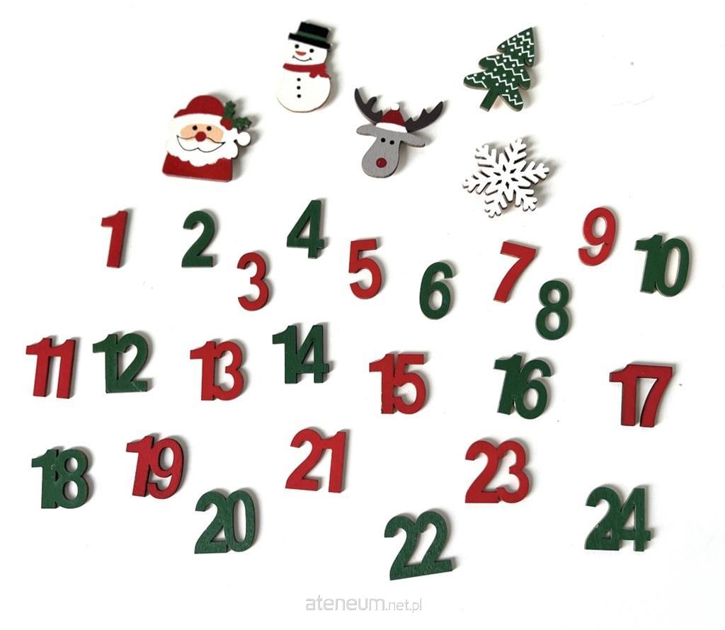 Zestaw zawiera liczby od 1 do 24 oraz 5 drewnianych elementów ze świątecznymi motywami.
