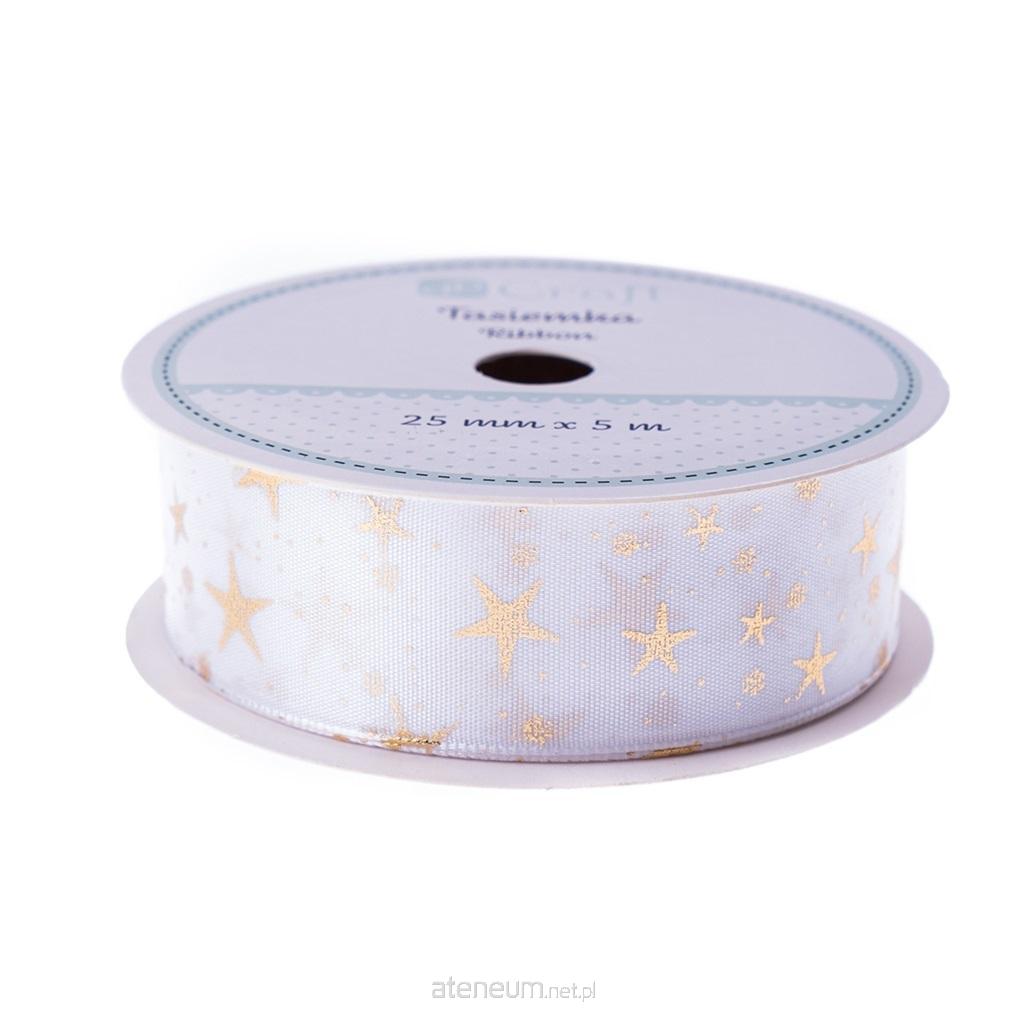 Satynowa tasiemka dekoracyjna w eleganckiej bieli ze złotym motywem gwiazdek i płatków śniegu.