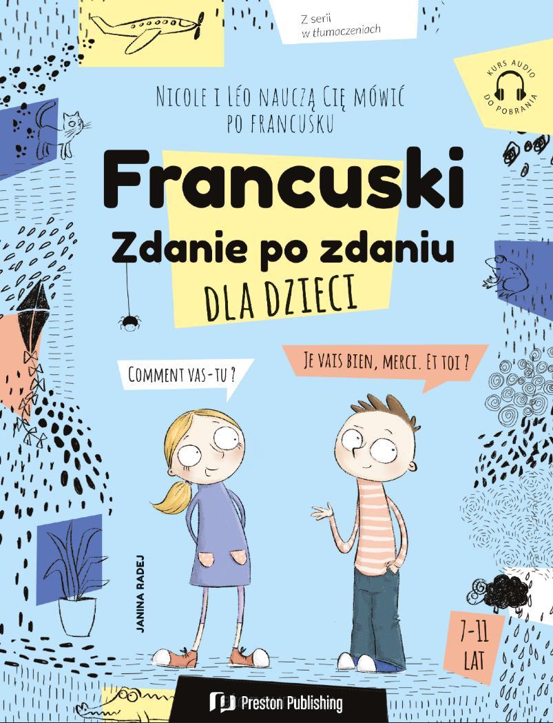 Chcesz, aby Twoje dziecko szybko poznało podstawy francuskiego, a nauka była dla niego łatwa i przyjemna? Dwoje bohaterów: urocza Nicole i zabawny Lo zachęcą Twoją pociechę do poznawania nowych słówek i tworzenia pierwszych zdań w języku francuskim! Nieważne, czy Twoje dziecko jest małą księżniczką jak Nicole, czy tak jak Lo marzy o karierze tresera żab Pięknie ilustrowanymi przygodami małych bohaterów zachwyci się każdy mały adept języka francuskiego. Francuski dla dzieci. Zdanie po zdaniu to praktyczny kurs językowy dla najmłodszych, który zawiera: dialogi dwójki bohaterów pełne francuskich zwrotów używanych w codziennej komunikacji, wskazówki na temat podstawowych struktur gramatycznych i przydatne słowniczki, zdania do przetłumaczenia, dzięki którym uczeń w praktyce wykorzysta zdobyte informacje, kurs audio MP3 do pobrania, czyli doskonały sposób na ćwiczenie francuskiej wymowy oraz rozumienia ze słuchu, mnóstwo pięknych ilustracji, które ułatwią naukę i sprawią, że stanie się ona świetną zabawą. Książka przeznaczona jest dla uczniów w wieku od 7 do 11 lat. Można ją traktować jako materiał do samodzielnej pracy lub domowe uzupełnienie nauki szkolnej. Sprawdzi się również na lekcjach języka francuskiego podczas pracy w większych grupach