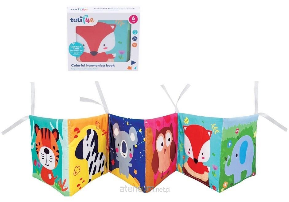 Materiałowa książeczka zabawi najmłodszych kolorowymi obrazkami. Z jednej strony harmonijki znajdują się urocze zwierzątka, a z drugiej, pojazdy. Poszczególne strony książeczki wykonane zostały z szeleszczącego materiału, dzięki czemu stymuluje ona zmysł dotyku i słuchu najmłodszych. Książeczka wyposażona została w praktyczne troczki, które pozwalają na przywiązanie jej do dziecięcego łóżeczka.