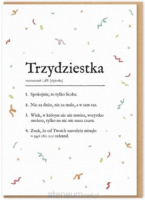 Trzydziestka: Spokojnie, to tylko liczba. Nie za dużo, nie za mało, a w sam raz. Wiek, w którym nic nie musisz, wszystko możesz, tylko na nic nie masz czasu. Znak, że od Twoich narodzin minęło 946 080 000 sekund. Kartka na 30. urodziny DEFINICJA TRZYDZIESTKI to oryginalny prezent urodzinowy dla trzydziestolatka. Sprawdzi się jako dodatek do upominku dla przyjaciela, który kończy 30 lat. Nic dwa razy się nie zdarza: drugiej takiej nie znajdziesz! Kartka urodzinowa w zestawie z kopertą jest pusta w środku. Została wydrukowana na papierze ekologicznym. Jej wnętrze czeka na wypełnienie treścią płynącą prosto z Twojego serca! Wyjątkowy prezent na urodziny dla przyjaciela jak znalazł! Kartka urodzinowa na trzydziestkęa Wymiary kartki (po złożeniu): 12 cm x 17 cm Gramatura papieru: 250 g/m2 W zestawie elegancka koperta z eko kraftu Wymiary koperty: 12,5 cm x 17,5 cm Gramatura koperty: 100 g/m2 Zestaw zapakowany w folię Wyprodukowano w Polsce