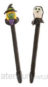 Długopis z motywem Halloween. Czarny długopis zakończony figurką w kształcie zabawnych wzorów czarownicy, kościotrupa oraz innych. Długopis o długości około 16,5 cm.