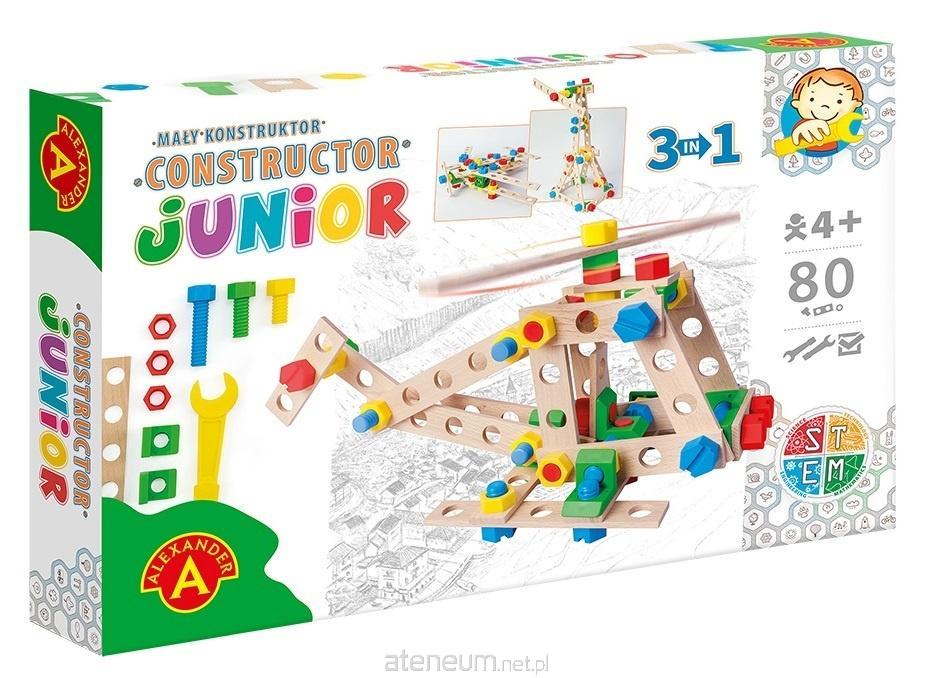 Mały Konstruktor Junior 3 in 1 HELICOPTER to ponadczasowa zabawka konstrukcyjna do samodzielnego montażu skierowana do dzieci w wieku od 4 lat. Zestaw składa się z drewnianych deseczek z dziurkami oraz kolorowych śrubek i łączników z tworzywa. Duże rozmiary elementów oraz uproszczona konstrukcja sprawiają, że dzieci już od najmłodszych lat mogą próbować sił w składaniu pierwszych pojazdów. Zabawka jest trwała i po złożeniu pojazd może służyć do dalszej zabawy. Zestaw wyposażony jest w narzędzia idealnie dopasowane do małych rączek, dzięki którym malec może wielokrotnie skręcać i rozkręcać konstrukcję. Z zawartych w opakowaniu elementów można zbudować aż trzy zupełnie różne pojazdy. Po skręceniu zabawki malec może przez jakiś czas bawić się nią, a kiedy znudzi mu się, może rozmontować wszystkie komponenty i zbudować zupełnie nowy model. Zabawka wspaniale wpływa na rozwój motoryki małej, rozwija cierpliwość oraz stymuluje wyobraźnię. Doskonale wspomaga naukę kolorów oraz liczenia. Wyjątkowa estetyka produktu i jakość wykonania umilają zabawę. Wszystkie komponenty wchodzące w skład produktu wytwarzane są w fabryce Alexandra.