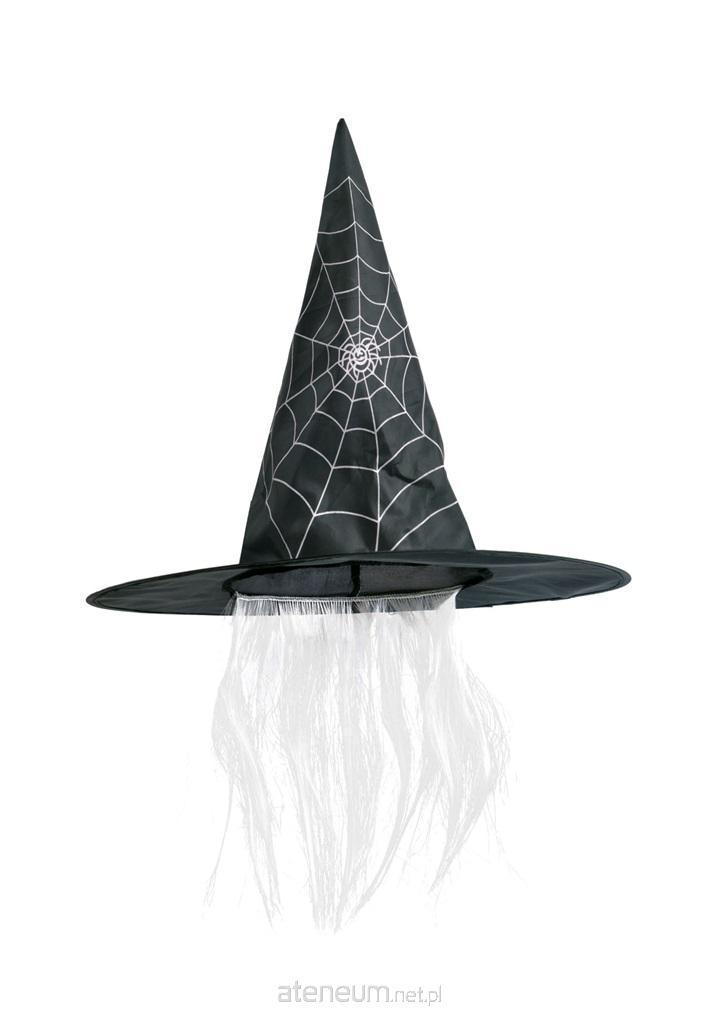 Czarny z białą pajęczyną i pająkiem oraz białymi włosami. Średnica kapelusza 38 cm, wysokość: 33cm.