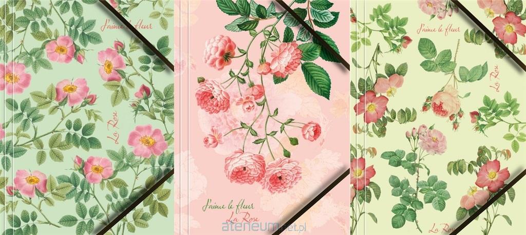 Teczka kartonowa z grafiką i gumką narożną, format A4, lakierowana. Wymiary teczki 320x240 mm. Dostępne w czterech zestawach, w każdym zestawie - 3 różne grafiki (M1-owoce, M2-liście, M3-pastelowe kwiaty, M4-róże). Opakowanie: folia 6 szt.