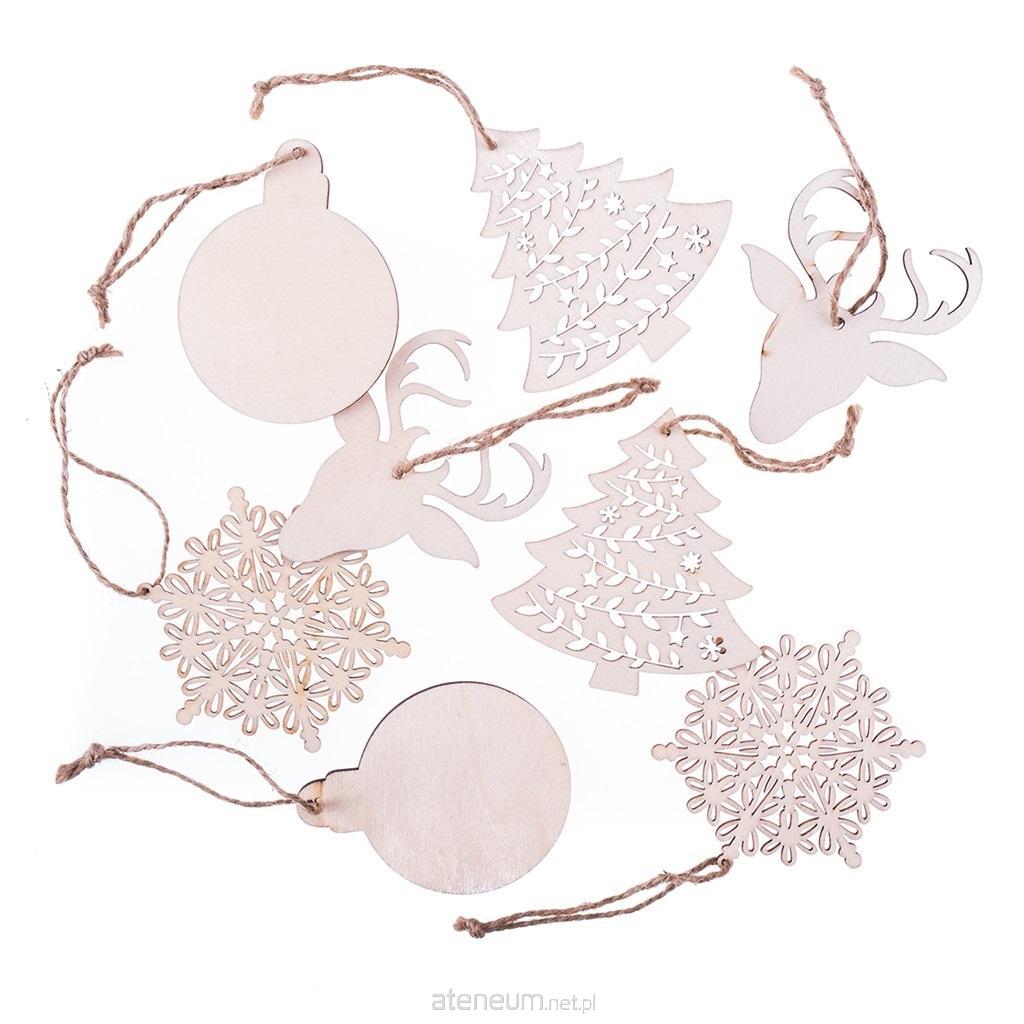 Drewniane zawieszki ze sznurkiem w 4 kształtach: głowy jelenia, bombki, ażurowej choinki i śnieżynki. Fantastyczna baza do kreatywnych prac dla dzieci i dorosłych.