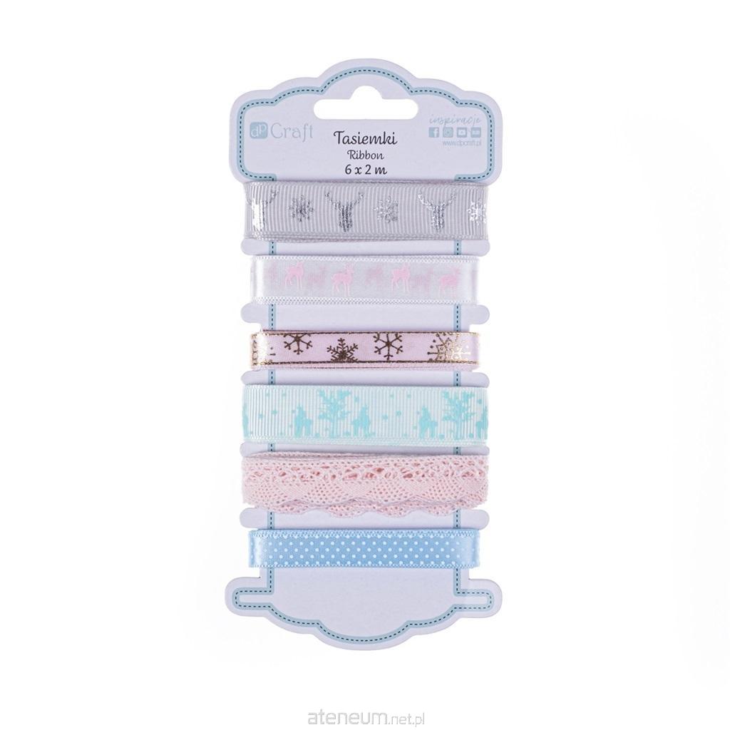 Zestaw satynowych i rypsowych tasiemek oraz koronek w pastelowych kolorach z motywami jelonków, drzewek i śniegu.