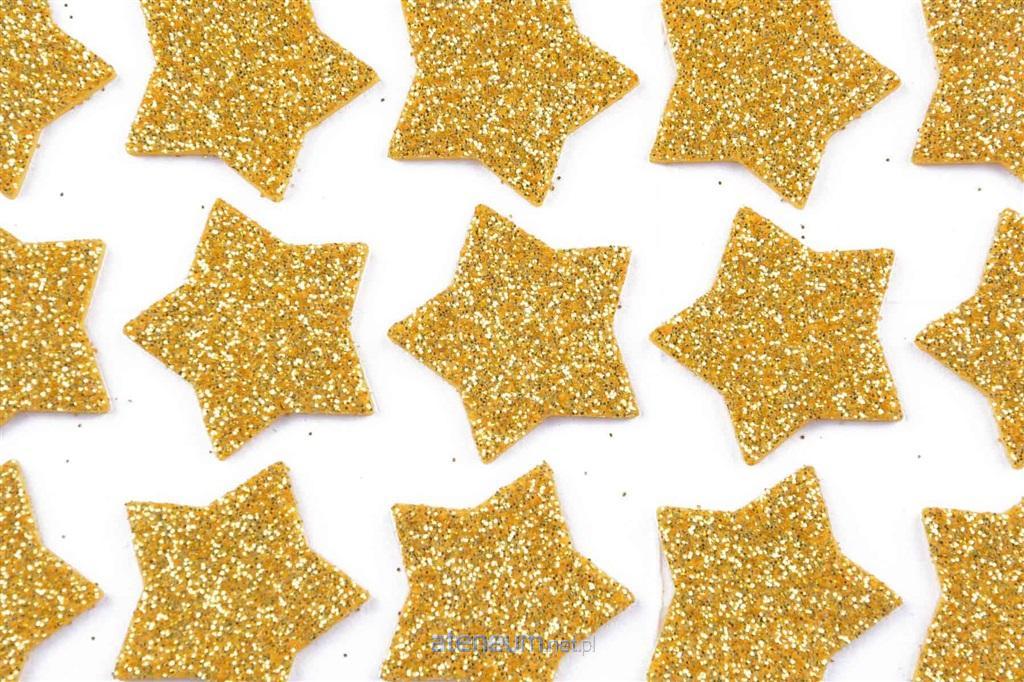Brokatowe złote naklejki wykonane z pianki w kształcie gwiazdek. Dają efekt elementów wypukłych na dekorowanej powierzchni. Idealne do kartek świątecznych, zimowych dekoracji, prac szkolnych, zabaw kreatywnych i DIY. Samoprzylepna ozdoba na blistrze o wymiarze: 11,5 x 25 cm.