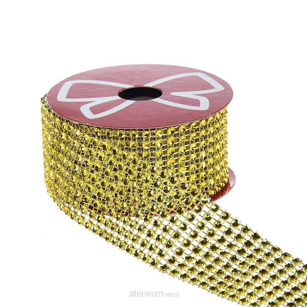 Dekoracyjna taśma o szerokości 4 cm, z kryształkami w kolorze złotym. Taśma nawinięta jest na kartonową szpulę zapobiegającą odkształcaniu się produktu. Element dekoracyjny do różnorodnych zdobień. Taśma mieni się i odbija światło dodając elegancji dekorowanym przedmiotom. Taśma o długości 100 cm.