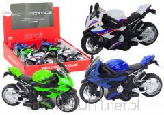 W zestawie: motocykl 14 cm., Funkcje: w czasie jazdy dźwięk pracy silnikia, hamowania, muzyka, świecący leflektor, napęd pull-back, baterie: , wym. Opk: 17 x 10,5 x 8 cm., 3+