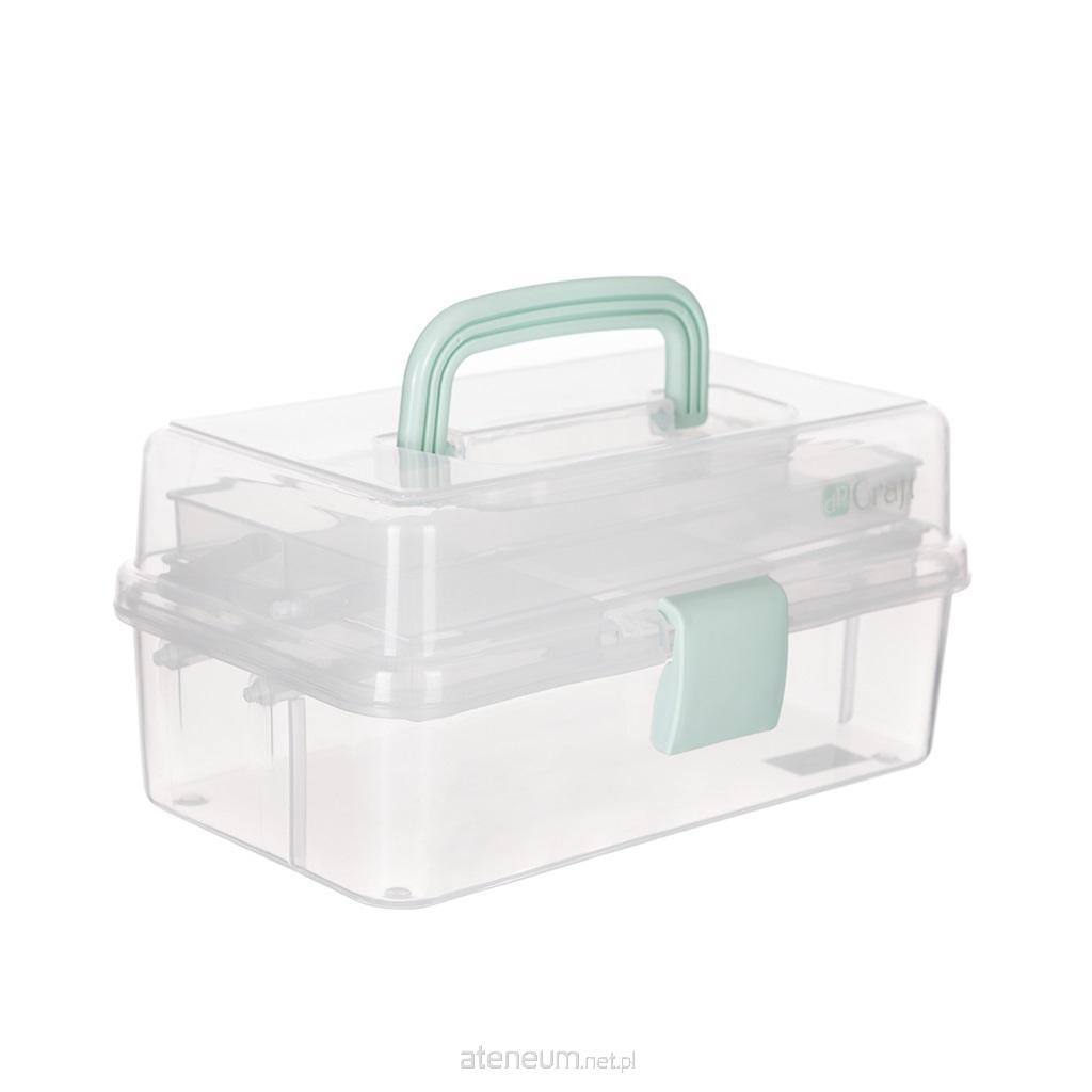 Plastikowy kuferek-organizer to must have każdego craftera! Idealny do przechowywania drobnych dodatków, ale też świetnie sprawdzi się jako pudełko na dziecięce skarby. Wykonany z przezroczystego plastiku, z rączką i zamknięciem w kolorze miętowym_x000D_