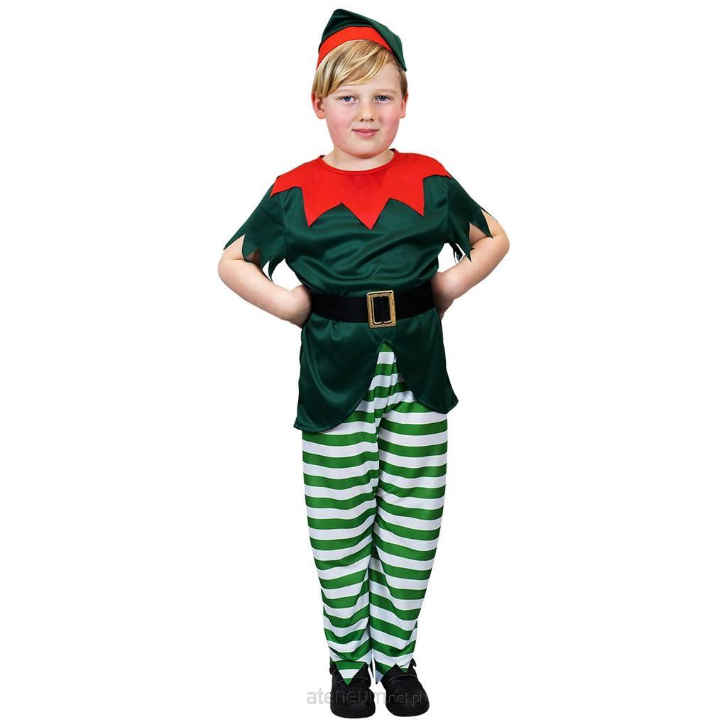Kostium elfa dla dziecka. W skład zestawu wchodzi czapka, bluzka z kołnierzykiem oraz spodnie i pasek. Zielona czapka obszyta u dołu czerwonym pasem ma wszytą gumkę, co ułatwia dopasowanie. Bluzka jest w kolorze zielonym z czerwonym kołnierzykiem. Spodnie z gumką w pasie są w białe oraz zielone pasy. Czarny pasek posiada plastikową klamrę w złotym kolorze. Pasek zapina się na rzep. Elf to idealny dziecięcy strój na zabawę tematyczną lub świąteczne przedstawienie. Strój w rozmiarze: S (110-120 cm).