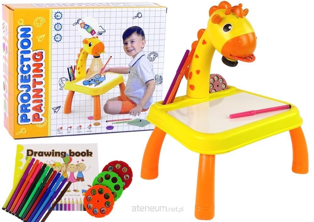 Dziecięcy projektor jest rewelacyjnym gadżetem dla wszystkich dzieci, które uwielbiają rysować i malować ! Rzutnik kryje w sobie aż 3 różnorodne funkcje, co jest gwarancją niekończącej się zabawy. Rysuj, pisz i zmazuj, wspaniała twórcza zabawa i nauka bez końca. Zestaw zawiera wszystko czego potrzebuje maluszek do kreatywnej zabawy. Tablica służy do pisania i rysowania mazakami suchościeralnymi.Za pomocą projektora dziecko może kopiować obrazki z dołączonych 24 wzorów tworząc tym niecodzienne ozdoby i tła do zabawy a przede wszystkim kreować własne, oryginalne prace. W zestawie znajdują się 3 dyski z 8 wzorami obrazków czyli razem 24 wzory, 12 mazaków w najpotrzebniejszych kolorach ,gąbka do zmazywania obrazków oraz dodatkowy blok papierowy do malowania.Projektor posiada włącznik on/off. Główka jest ruchoma (góra-dół), natomiast całe ramie można przesuwać w lewo i prawo. Po przesunięciu włącznika raz oświeca się światło, a po przesunięciu drugi raz uruchamiają się melodyjki. Dzięki temu można malować z muzyką, albo bez. Projektor gra 12 różnych melodyjek. Pod spodem główki znajduje się regulacja ostrości obrazu. Rzutnik posiada zdejmowane nóżki, dzięki czemu można go pochylić lub na płasko postawić na biurku. Z projektorem rysowanie staje się o wiele fajniejsze!Wystarczy włożyć dysk w szczelinę projektora i przycisnąć przycisk aby włączyć rzutnik. Po włączeniu projektora zaświeca się światełko, po włożeniu krążka wyświetlają się slajdy. Slajdy można wyświetlać na podstawie projektora i odrysowywać w notesiku albo bezpośrednio na podstawie. Do odrysowania mamy aż 24 ładne, kolorowe obrazki takie jak zwierzęta, pojazdy ,warzywa czy owoce.Na podstawie można bezpośrednio malować mazakami, rysunki zmazujemy ściereczką, która również jest w zestawie. Można również skierować projektor na ścianę i wyświetlać na ścianie slajdy. Projektor może również pełnić funkcję lampki. Dzięki stolikowi dziecko będzie miało zabawę na długie godziny, ćwicząc koncentracje, wyobraźnię, cierpliwość i zdolności manualne!Obrazki na slajdach: - Owoce i warzywa: jabłko, ananas, pomidorki, pomarańcze, winogrona, wiśnie, gruszka, arbuz -