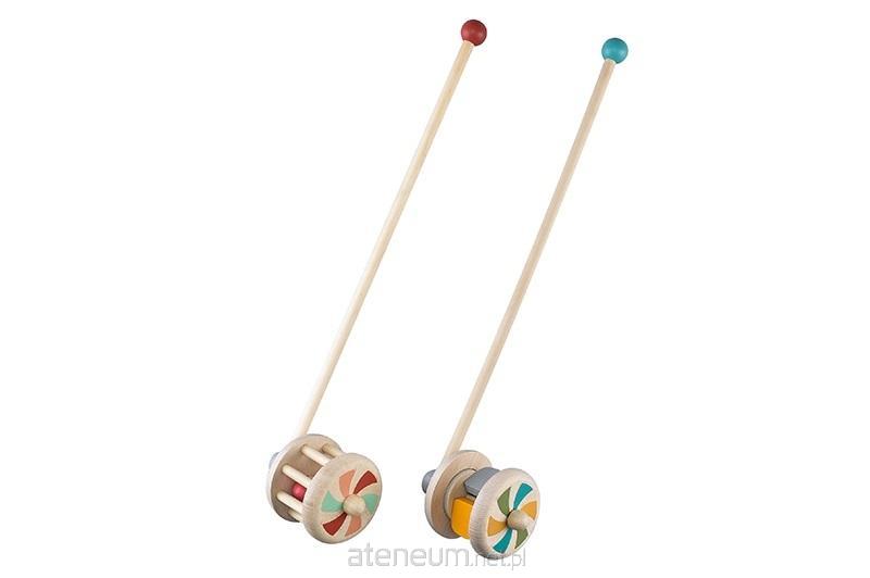 Wzór nr 1 posiada: drewniane szczebelki, 4 kolorowe kulki, Wzór nr 2 posiada: 5 kolorowych klocków stukających o siebie podczas obrotu. Wym. pchanki: 13,5 x 56 x 9 cm.
