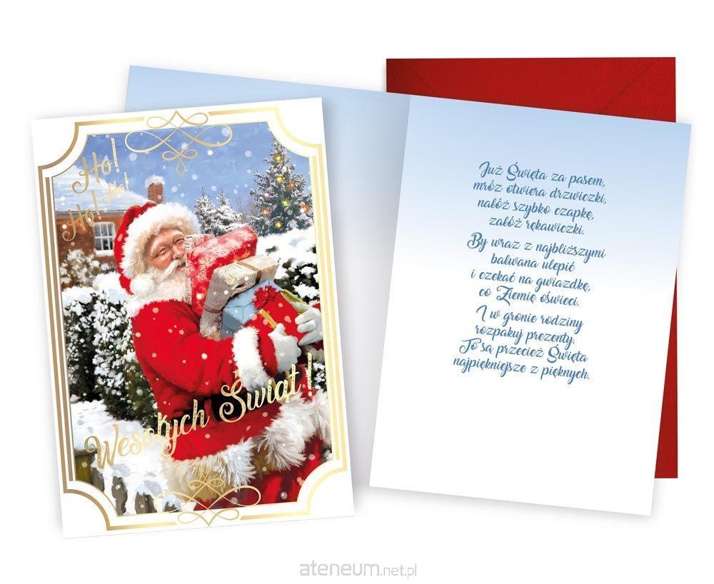 Kartka wielkości B6, zdobiona w zależności od wzoru metaliczną folią lub brokatem. Każda kartka posiada kolorowe życzenia w środku i dopasowaną kopertę w komplecie. Wymiary karnetu po złożeniu: 11,7 x 16,6 cm.