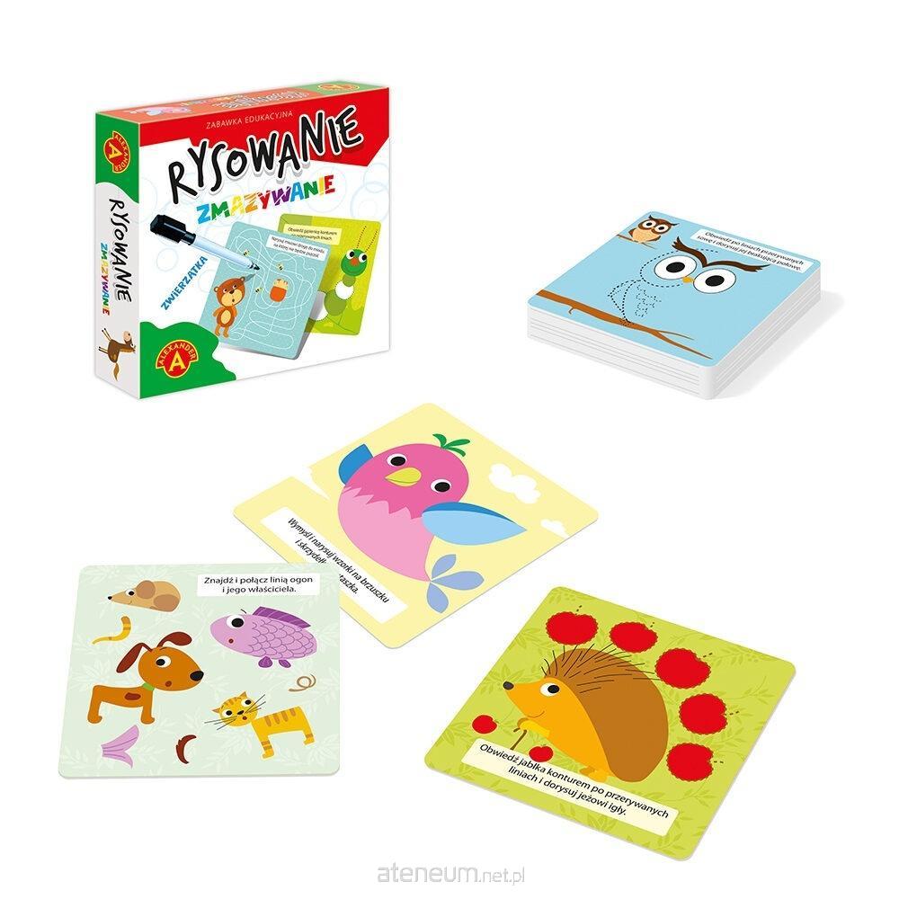 Zabawka edukacyjna, dedykowana dzieciom przygotowującym się do nauki pisania. Rysowanie Zmazywanie - Zwierzątka to zestaw 17 dwustronnych plansz, na których znajdują się zadania na spostrzegawczość, myślenie, wyobraźnię i ćwiczenie zręczności manualnej. W zestawie znajduje się również pisak, którego ślad po użyciu, można łatwo zetrzeć dzięki czemu zabawę można powtarzać wielokrotnie. Poręczny rozmiar opakowania pozwala na zabranie zabawki ze sobą dosłownie wszędzie..