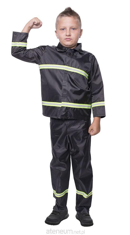 Przebranie dla dziecka - strażak. W skład zestawu wchodzi bluza z długimi rękawami oraz spodnie. Strój w kolorze czarnym. Z tyłu posiada napis ""STRAŻ"". Przebranie na bal przebierańców, halloween, zabawy tematyczne, zabawy w przedszkolu i szkole. Strój w rozmiarze S na wzrost 110 cm - 120 cm