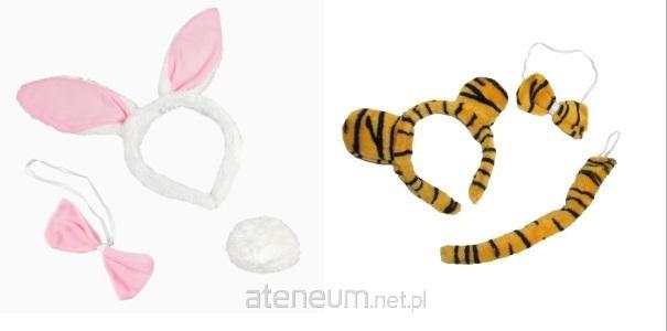 Komplet z motywem zwierzaków wykonany z miękkiego materiału. W zestawie opaska z uszami,ogonek oraz muszkę na gumce. Wymiary: opaska 14x13 cm, ogonek 25 cm, muszka 10,5 cm. Wzór: tygrys lub królik