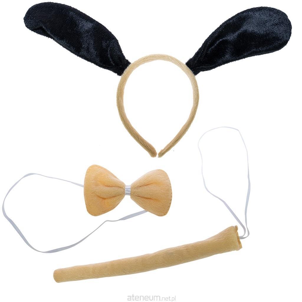 Komplet akcesoriów do stroju pieska. Zestaw wykonany z miękkiego materiału. W skład zestawu wchodzi opaska na głowę z uszami, muszka oraz ogonek. Ogon oraz mucha zostały wyposażone w elastyczną gumkę ułatwiającą ich założenie oraz zapewniającą komfortowe noszenie podczas zabawy. Komplet może być świetnym dodatkiem do stroju na bal przebierańców, zabawę tematyczną lub przedstawienie.