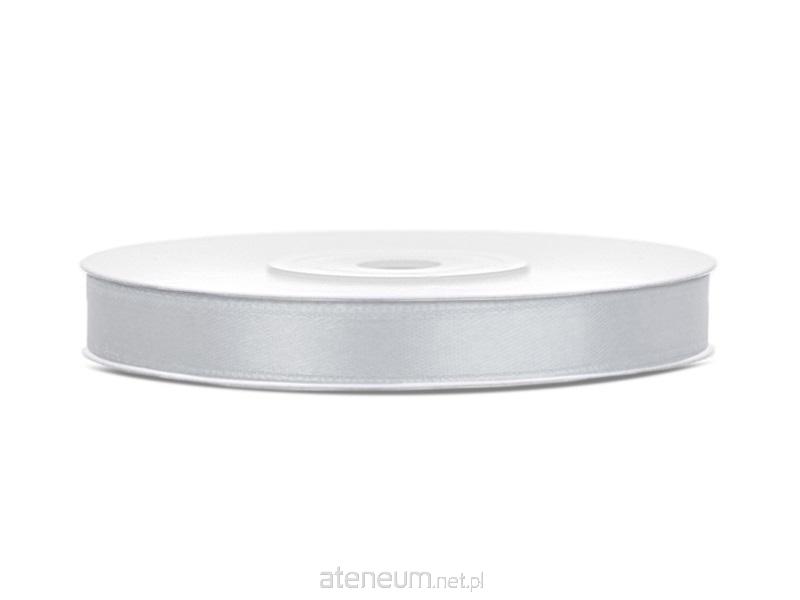Tasiemka satynowa w kolorze srebrnym, szerokość 6 milimetrów, długość 25 metrów.