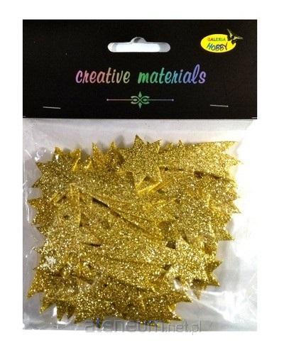 Zestaw elementów w formie komet z pianki brokatowej wielkości 70 mm , zawierający ok. 50 elementów, pakowany w eleganckie opakowanie z eurozawieszką. Elementy można naklejać na każdą powierzchnię lub używać do innych zdobień. Opakowanie zawiera elementy w kolorze złotym.