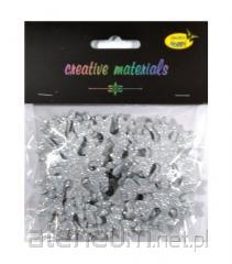 Zestaw elementów w formie śnieżynek z pianki brokatowej wielkości 50 mm , zawierający ok. 30 elementów, pakowany w eleganckie opakowanie z eurozawieszką. Elementy można naklejać na każdą powierzchnię lub używać do innych zdobień.Opakowanie zawiera elementy w kolorze białym.