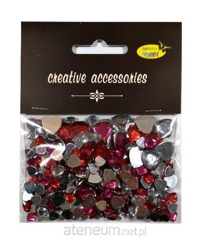 Kryształki z płaskim spodem wykonane z przezroczystego tworzywa sztucznego w kształcie serca. Spód srebrny metalizowany. Opakowanie z eurozawieszką zawiera 23 gram elementów różnej wielkości w kolorze czerwonym