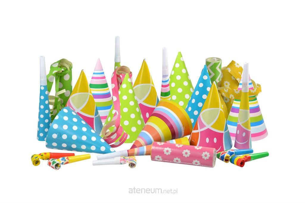Gadżety imprezowe o wymiarach: czapeczka 16 cm średnica 10 cm, trąbka 19 cm, gwizdek 9 cm (rozwinięty 2,5x35 cm), serpentyny 18 krążków.