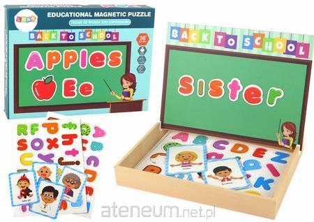 Zestaw edukacyjnych puzzli magnetycznych. W skrzynce znajdziesz litery, karty z nazwami rodzin, i tablicę magnetyczną z dwoma stronami. Jedna strona to miejsce na układanie słów, druga pozwala na rysowanie pisakiem (w zestawie). Zabawa i nauka w jednym.