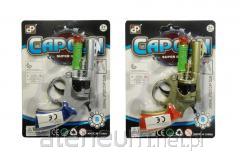 Pistolet zabawkowy: Wykonany z bezpiecznego tworzywa, z pomarańczową końcówką lufy, co jest zgodne ze standardami bezpieczeństwa.