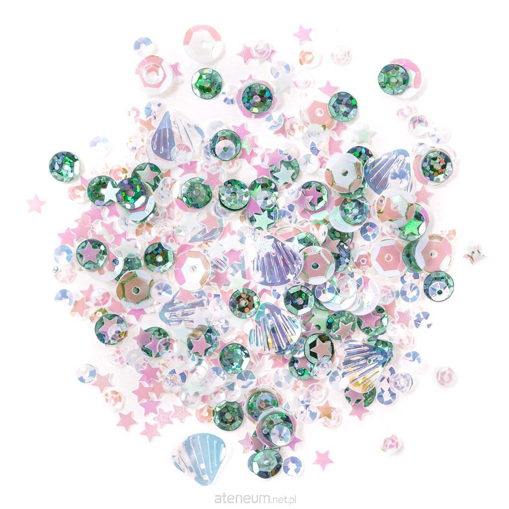 Mix cekinów opalizujących "Mermaid" to wyjątkowa kompozycja składająca się z niesamowitych kształtów i kolorów. Zestaw ten zawiera aż pięć rodzajów cekinów. Znajdziesz w nim klasyczne, okrągłe w trzech rozmiarach, a także gwiazdki oraz muszelki. Cekiny z kompozycji "Mermaid" mają piękne opalizujące kolory: od półprzezroczystego przez mlecznoróżowy, aż do mieniącego się miętowego.