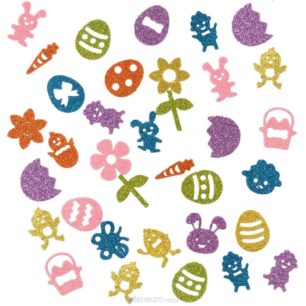 Piankowe naklejki brokatowe. Mix kolorowych wzorów wielkanocnych. Idealne do dekoracji wielkanocnych, kartek świątecznych, prac szkolnych. Naklejki na blistrze o wymiarze 17x17 cm.