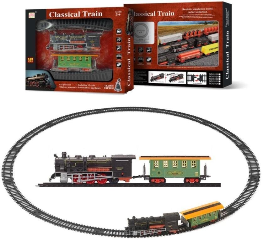 Pociąg-kolejka na baterie w zestawie z torami do złożenia w kształt owalu o szerokości ponad 100cm.