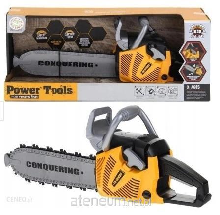 Imitacja linki rozruchowej z lewej strony służy do odpalania piły, wystarczy ją delikatnie pociągnąć, a urządzenie wyda dźwięk odpalania silnika. By włączyć łańcuch, należy wcisnąć i przytrzymać dolny guzik na rączce. Łańcuch jest gumowy i całkowicie bezpieczny dla dzieci, piła posiada realistyczne dźwięki