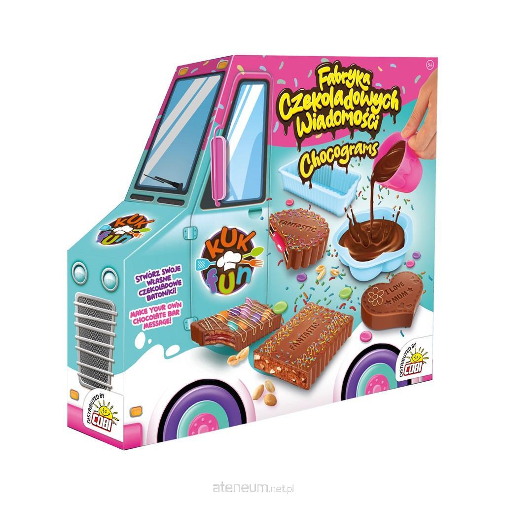 KUK FUN to kolekcja akcesoriów do przygotowania lodowych oraz czekoladowych deserów. Każdy zestaw zawiera niezbędne formy, narzędzia do przygotowania samodzielnie, w domu, orzeźwiających lodów tajskich, czekoladowych batoników czy też czekoladowej biżuterii! THT-002A2 - KUK FUN Fabryka Czekoladowych Wiadomości Przygotuj czekoladowe batoniki i przekaż na nich wiadomości dla przyjaciół, rodziny! Wybierz kształt foremki i tekst wiadomości jaką chcesz przekazać, napełnij foremkę rozpuszczoną czekoladą (nie zawarta w zestawie) poczekaj, aż zastygnie. Do środka batonika możesz dodać, czyli zatopić w czekoladzie, ulubione dodatki: czekoladowe pastylki, chrupki, czy pokruszone herbatniki, a wierzch możesz udekorować kolorową posypką lub orzeszkami. Przekaż czekoladową wiadomość przyjaciółce! Zawartość: kubek, 5 foremek o różnych kształtach, 5 przykrywek do foremek, 21 tabliczek tekstowych, instrukcja/książeczka z przepisami. Zestaw nie zawiera składników spożywczych. Produkt dla dzieci 3+