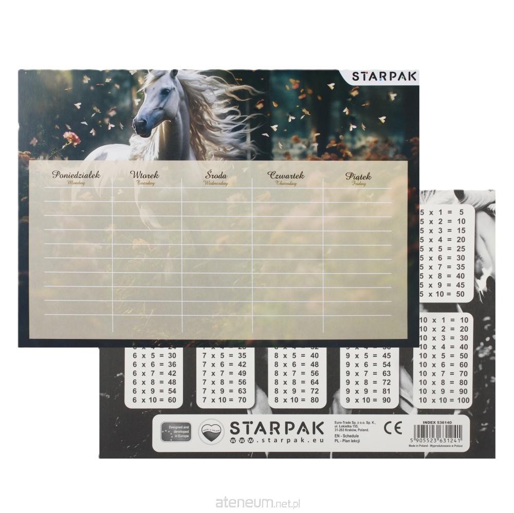 Plan lekcji jest niezbędnym elementem wyposażenia szkolnej wyprawki. Plan z kolekcji STARPAK Horse, zawiera podział na pięć dni tygodnia z 9 wierszami do wpisu, dzięki czemu żaden uczeń nie zapomni o potrzebnych mu danego dnia książkach czy zeszytach, dodatkowo na odwrotnej stronie posiada tabliczkę mnożenia. Przyjazna grafika sprawi, że każdy dzień w szkole będzie dobrze zaplanowany i udany. Zapoznaj się również z innymi produktami Starpak! Plan lekcji wykonany z papieru.