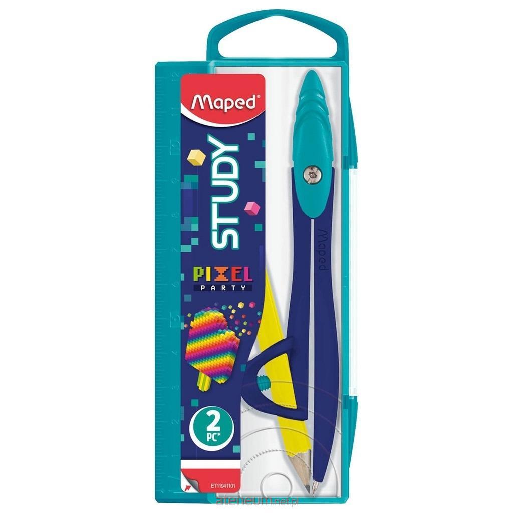 Cyrkiel Study Pixel z uniwersalnym uchwytem na ołówek. W zestawie ołówek drewniany w wersji mini, ergonomiczny uchwyt, plastikowe etui z wbudowaną linijką o długości 12 cm.