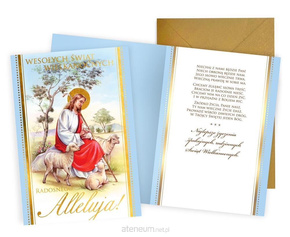 Kartka wielkości B6, zdobiona w zależności od wzoru metaliczną folią lub brokatem. Każda kartka posiada kolorowe życzenia w środku i dopasowaną kopertę w komplecie.