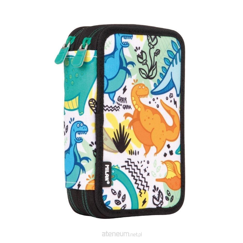 Piórnik 2 - poziomowy z wyposażeniem, który pozwala utrzymać przybory szkolne zawsze w porządku i łatwo dostępne. Specjalna kolekcja Dinos, w której głównymi bohaterami są przyjazne dinozaury żyjące wśród kolorowej roślinności. Nadruk w jasnych kolorach: zielonym, niebieskim, pomarańczowym i żółtym na białym materiale. Zamek błyskawiczny i detale w kolorze czarnym. Wyposażenie: 12 kredek trójkątnych, 18 flamastrów ze stożkową końcówką, długopis P1 niebieski, ołówek sześciokątny HB, linijka trójkątna 15 cm, temperówka kwadratowa AFILA, 2 gumki (4024 i niebieska 7024B). Przy produkcji piórników użyto najlepszych materiałów, bardzo wytrzymałych suwaków oraz wzmocnionych nici. Niepowtarzalne wzornictwo. W piórnikach znajdziesz m. in.: kredki MILAN przy produkcji których użyto drewna pochodzącego wyłącznie z plantacji, gwarantujących nieużywanie drewna z lasów deszczowych. Rysik kredki na całej długości jest przyklejony do drewna co zapobiega jego łamaniu. Dzięki trójkątnej budowie kredka jest ergonomiczna i wygodnie trzyma się dziecku. Flamastry MILAN posiadają wytrzymałą i elastyczną stożkową końcówką, która nie wpada do środka nawet przy silnym nacisku. Po chwilowym odkształceniu końcówka zawsze wraca do pierwotnego kształtu. Tusz na bazie wody. Flamastry nie zawierają ftalanów, metali ciężkich i innych. Temperówkę z bezpiecznym przykręconym ostrzem dzięki czemu ostrze nie oddzieli się od obudowy temperówki. Gumkę z naturalnym kauczukiem. Skład Materiał zewnętrzny i wewnętrzny 100% poliester. Wymiary: 19,5 x 13 x 5 cm.