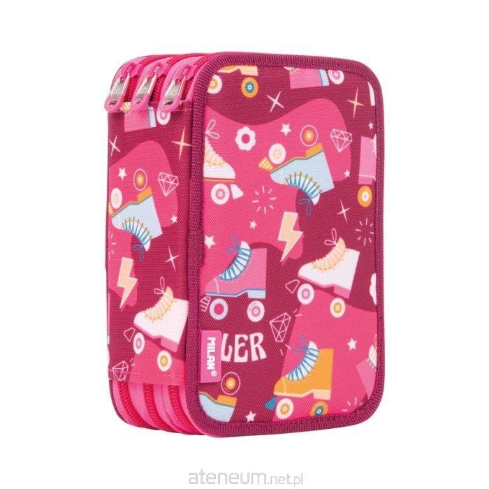 Piórnik 3 - poziomowy z wyposażeniem z kolekcji ROLLER, który pozwala utrzymać przybory szkolne zawsze w porządku i łatwo dostępne. W kolorze różowym z nadrukiem inspirowanym wrotkami retro. Wyposażenie: 12 kredek trójkątnych, 6 kredek metalizowanych, 18 flamastrów ze stożkową końcówką, 3 długopisy P1: czarny, czerwony i niebieski; ołówek sześciokątny HB, 5 zakreślaczy, linijka trójkątna 15 cm, temperówka kwadratowa AFILA, nożyczki BASIC, gumka 4024. Każdy poziom osobno zapinany na suwak. Przy produkcji piórników użyto najlepszych materiałów, bardzo wytrzymałych suwaków oraz wzmocnionych nici. Niepowtarzalne wzornictwo. Skład: Materiał zewnętrzny i wewnętrzny 100% poliester. Rozmiar piórnika: 19,5 x 13 x 7,5 cm. W piórnikach znajdziesz min.: kredki MILAN przy produkcji których użyto drewna pochodzącego wyłącznie z plantacji, gwarantujących nieużywanie drewna z lasów deszczowych. Rysik kredki na całej długości jest przyklejony do drewna co zapobiega jego łamaniu. Dzięki trójkątnej budowie kredka jest ergonomiczna i wygodnie trzyma się dziecku. Flamastry MILAN posiadają wytrzymałą i elastyczną stożkową końcówką, która nie wpada do środka nawet przy silnym nacisku. Po chwilowym odkształceniu końcówka zawsze wraca do pierwotnego kształtu. Tusz na bazie wody. Flamastry nie zawierają ftalanów, metali ciężkich i innych. Temperówkę z bezpiecznym przykręconym ostrzem dzięki czemu ostrze nie oddzieli się od obudowy temperówki. Gumkę z naturalnym kauczukiem.