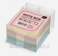Karteczki samoprzylepne PASTEL. Cały blok zawiera 100 karteczek, po 25 z każdego z 4 pastelowych kolorów: żółtego, niebieskiego, różowego i zielonego. Karteczki są ułożone naprzemiennie z arkuszem każdego koloru. Rozmiar: 76 x 76 mm.