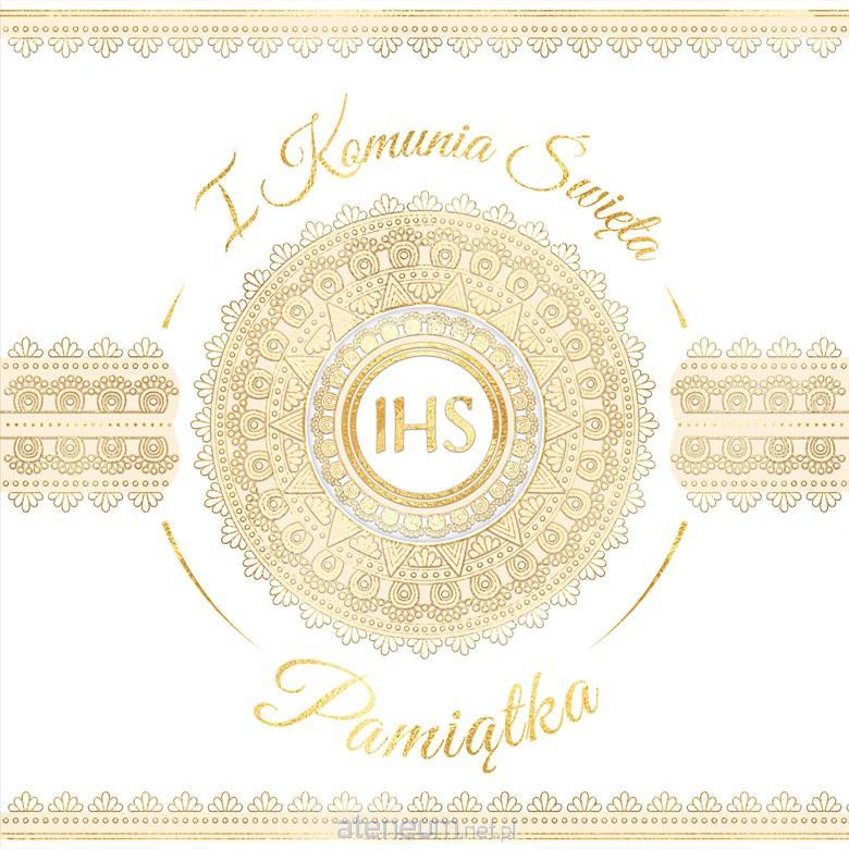 Składany z trzech stron kwadratowy karnet o wymiarach 15 x 15 cm z wyciętym elementem na froncie. Złocony i tłoczony, teksy życzeń w środku. Wydrukowany na wysokiej jakości papierze. W zestawie koperta.