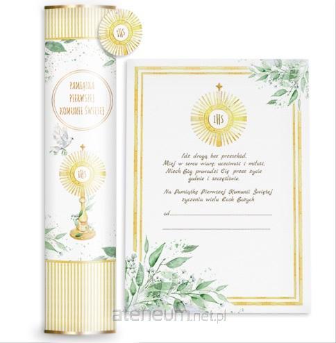 Tuba Komunijna, wysokość 25cm,średnica 5 cm. Bogato złocona, zamykana stalowymi złotymi wieczkami. W komplecie kartka z życzeniami A4 z obwolutą i bilecikiem. Całość zapakowana w worek foliowy z wstążką i przywieszką.