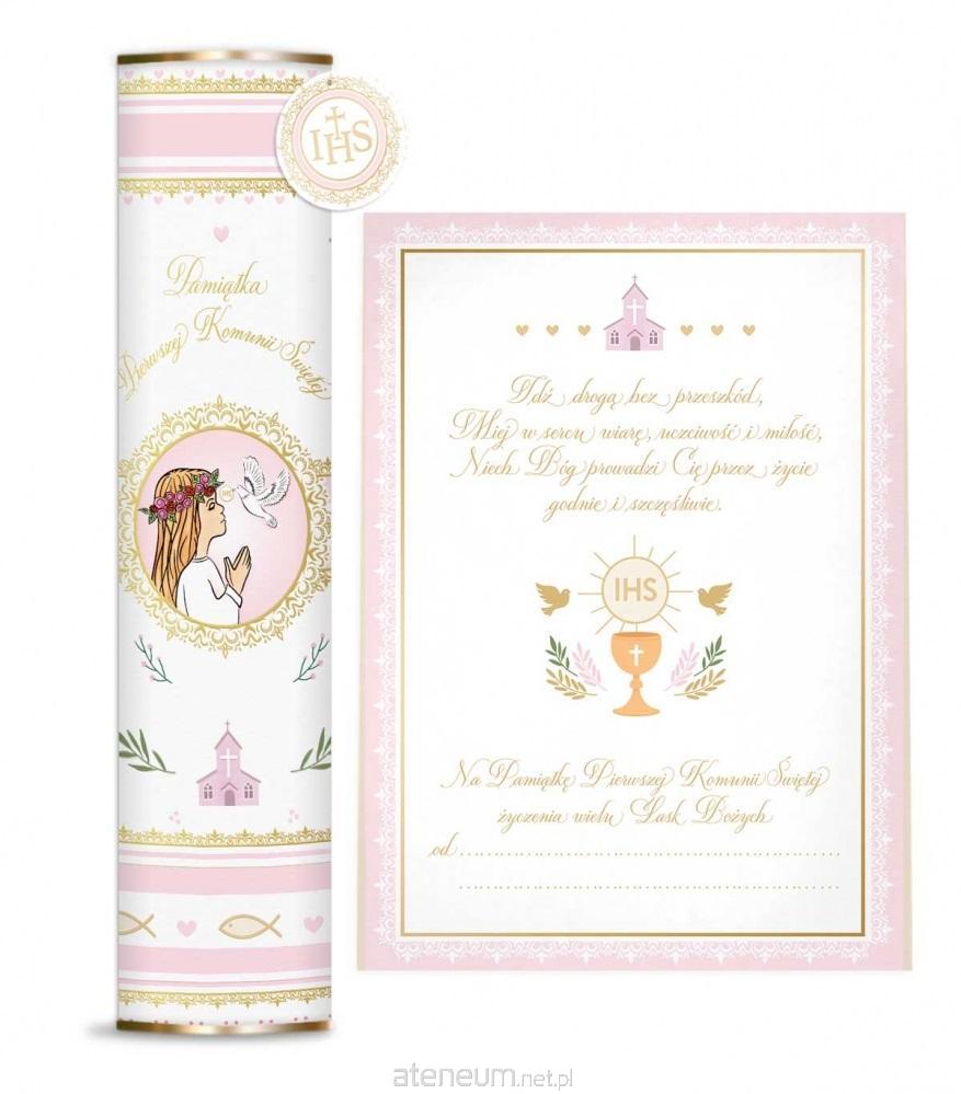 Tuba Komunijna, wysokość 25cm,średnica 5 cm. Bogato złocona, zamykana stalowymi złotymi wieczkami. W komplecie kartka z życzeniami A4 z obwolutą i bilecikiem. Całość zapakowana w worek foliowy z wstążką i przywieszką.